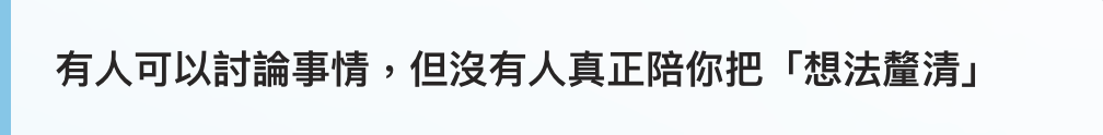 你好像知道如何行動,但是充滿了不確定,你需要有人一起討論:關鍵的判斷是否全面?思考的未來是否有更好的選項?遇到的困難有沒有更好的解決方法?