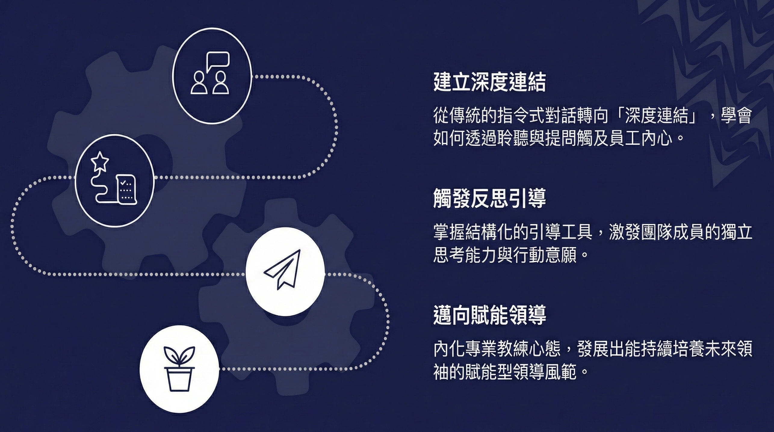 - 結合 ICF 專業教練核心能力與遊戲化引導,協助您的領導團隊掌握深度對話心法,創造高績效、高凝聚力的組織文化。